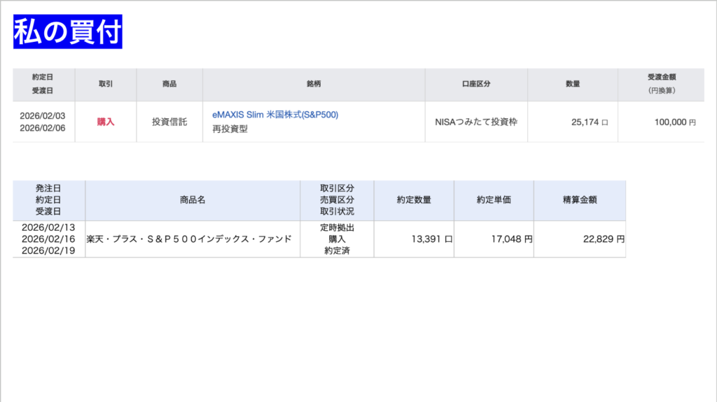 私の口座では毎月10万円NISAつみたて投資枠でeMAXISSlimS&P500を買い付けています。