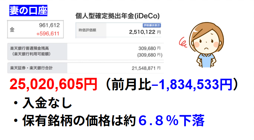 メインで運用しているeMAXISSlimS&P500とオールカントリーの基準価格が約5%下落したので夫婦とも保有銘柄の価格が下落しています。