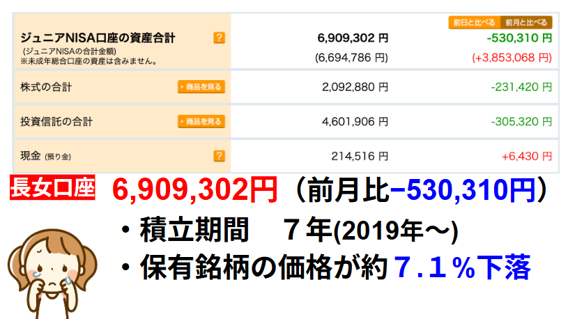 3月は株式、投信両方下落したので長女次女両口座とも大幅下落となりました。