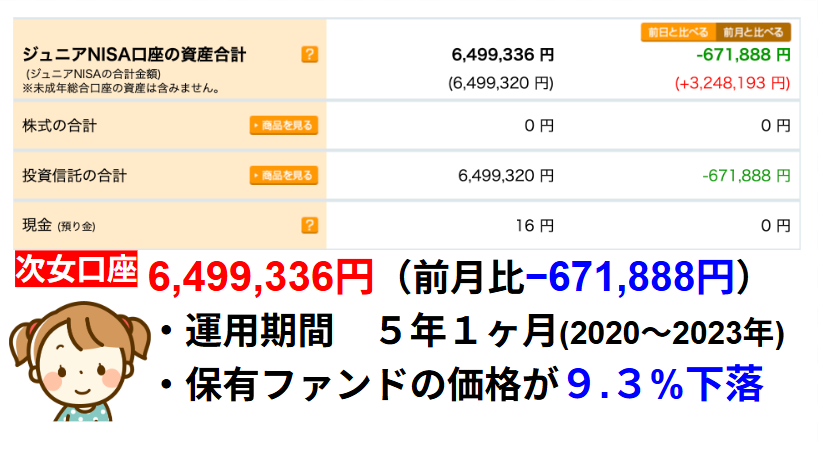 どちらのジュニアNISA口座ともインデックス投資メインですが、長女は3分の1は高配当銘柄を保有、次女は一部レバレッジの投資信託を保有しているので毎月の運用結果に違いがあります。