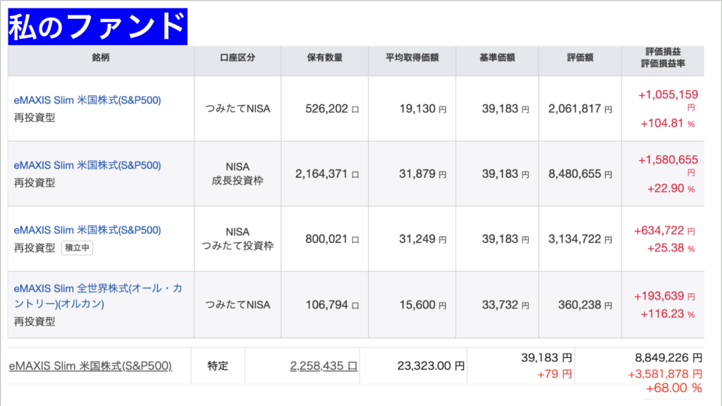 現在はeMAXIS SlimS&P500のみ運用しています。運用期間が長いので評価益が多いです。