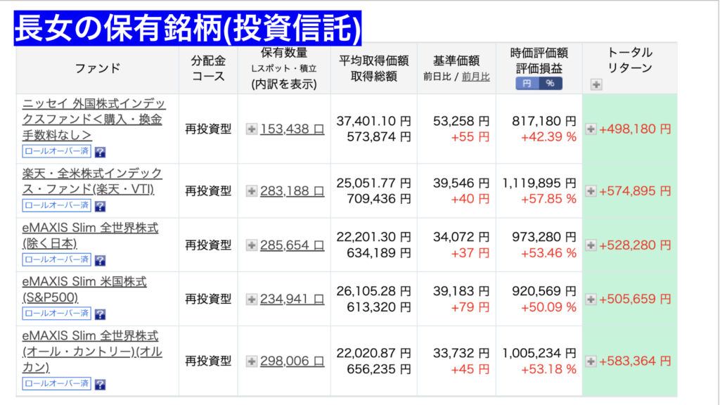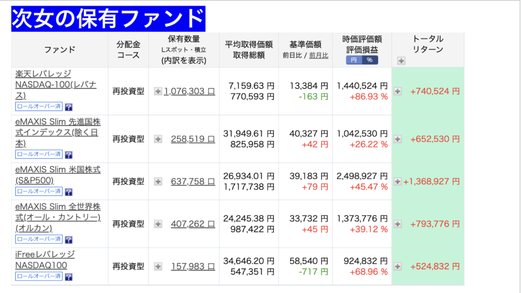 米国株オンリーしかもレバナス運用なので株価上昇時は次女のポートフォリオが一番上昇率が高いです。下落率も高いですが。