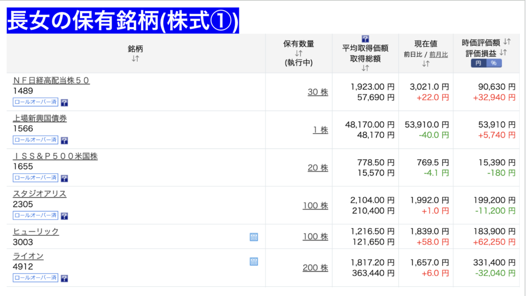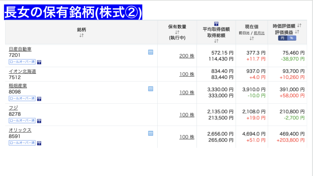 長女は昔の夫婦の投資の名残で少し日本株を保有しています。6年以上前は夫婦とも優待銘柄をよく買い付けていました。