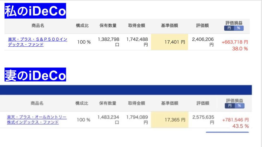 iDeCoは私がS&P500、妻がオルカンを運用しています。